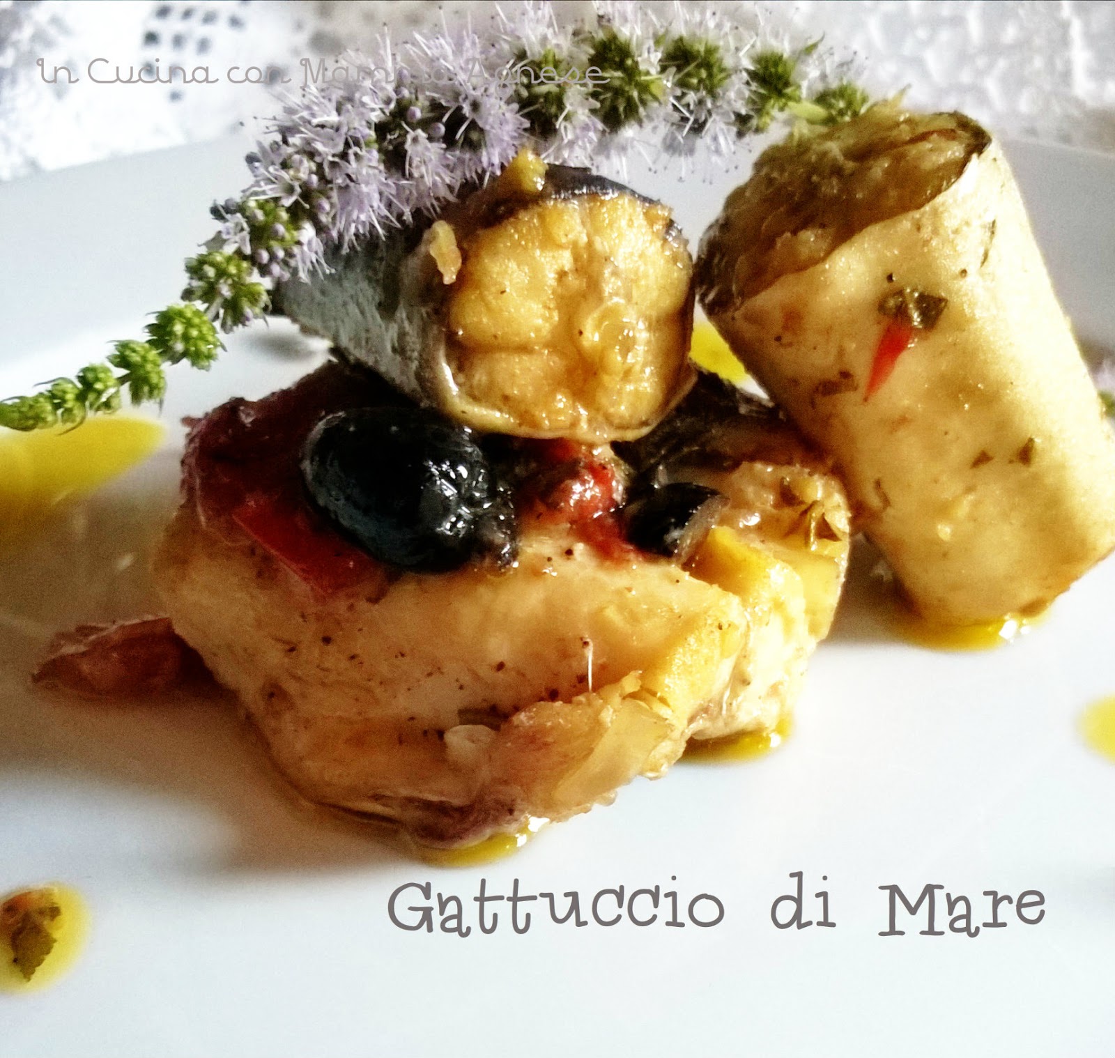 nel frattempo pulire e tagliare a tocchi il Gattuccio di Mare, passarlo leggermente nella farina, inserirlo nella padella, dorare da tutti i lati per qualche minuto, unire il passato di pomodoro, e le olive nere denocciolate, ed alcune foglioline di Basilico fresco, coprire e cuocere per circa 20 minuti, all'ultimo aggiustare di sale